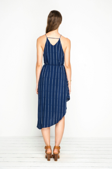 The April Wrap Dress by Bird & Kite is available at The Annex in navy. Featuring thin straps, rounded high neckline, side seam invisible zipper and front neckline pleat detailing this dress finishes just below the knee at mid length with rounded hem and wrap belt tie.