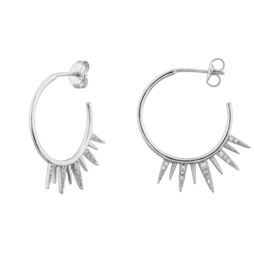 The Arushi Hoop Earring by Shashi created in 18K gold plated is a classic hoop detailed with rhinestone spikes. An edgy twist on a classic staple. Available now at The Annex in White Gold.