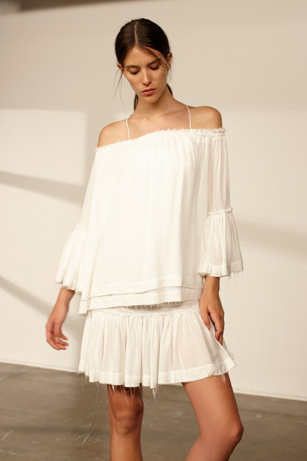 The Balboa Off The Shoulder Top by C&M CAMILLA AND MARC is available now at The Annex in White. Featuring an off shoulder elasticated design, raw and exposed edges with a relaxed fit and flounce bell sleeves. A great summer staple for every wardrobe!