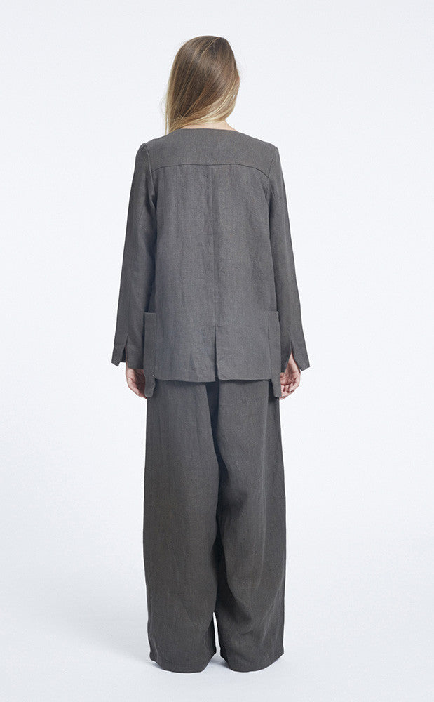 The Convoy Blazer by Zulu and Zephyr is a luxe clean line blazer made in 100% Linen featuring a minimalist neckline, front patch pocket detailing with a tailored fit. Available now in charcoal, perfect to match with almost anything!