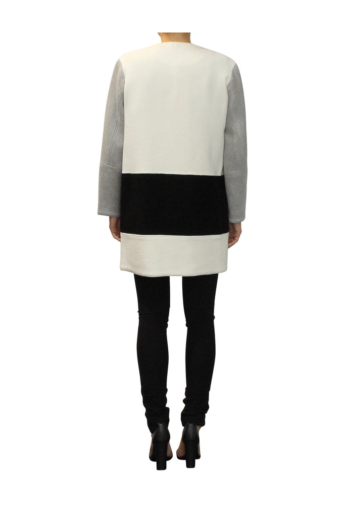 The Manning Cartell Factory Coat is crafted in fine wool cashmere with graphic panel detailing in black, white and grey. The coat is collarless with a slight dropped shoulder, contrast textured sleeves, black metal zip at the centre front and sleeve cuff.