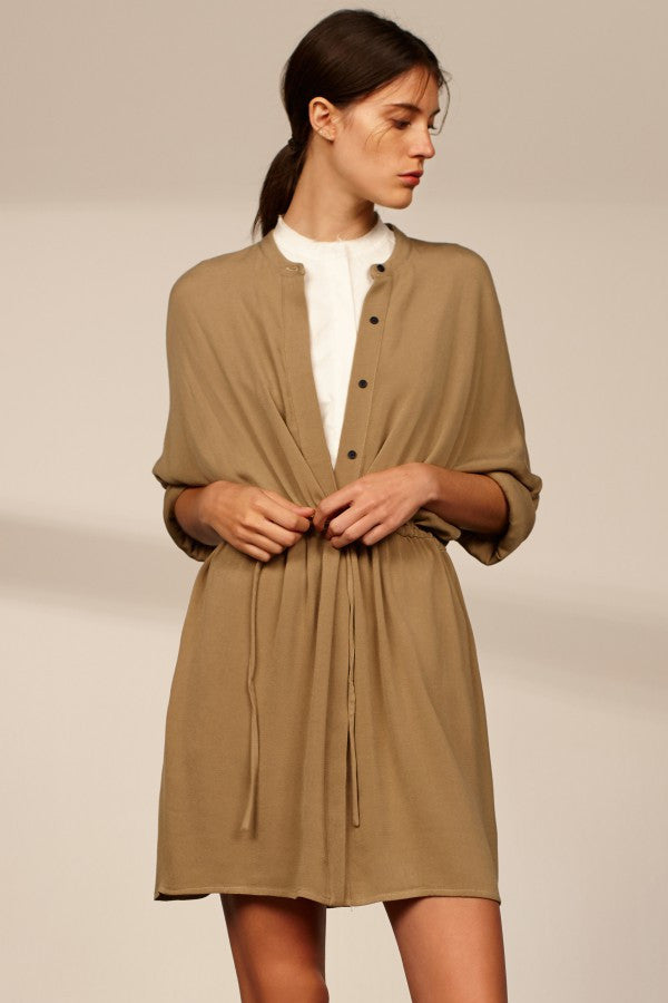 The Fairfax Shirt Dress by C&M CAMILLA AND MARC is a drawstring mini dress designed for everyday and available at The Annex in camel. This shirt dress features a mandarin collar, kimono style sleeves, external draw cord at waist line and side seam pockets.