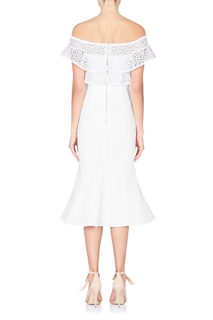The Farina Flare Midi Dress by Rebecca Vallance is a strapless style with a flare hem line. Featuring ruffle bodice panels in the signature RV daisy embroidered lace, this midi length dress has a flattering off the shoulder next line perfect for any evening occasion.
