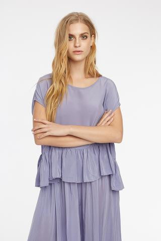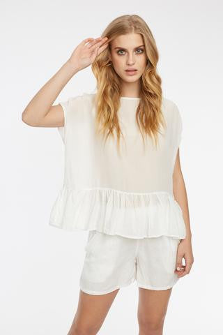 The Feather Top by Primness is avaiable at The Annex in Blanc. Crafted in a 100% silk this boxy blouse features dropped shoulders and a gathered peplum hem, perfect to dress up or down!