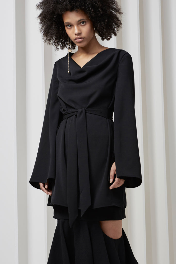 C/meo Collective Interrupt Long Sleeve Dress is your soft drapey mini dress in black, featuring a cowl neck, sheer sleeves and detactable belt. A must have classic. Shop it now at The Annex.