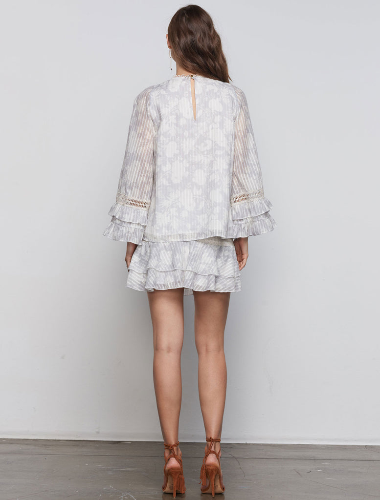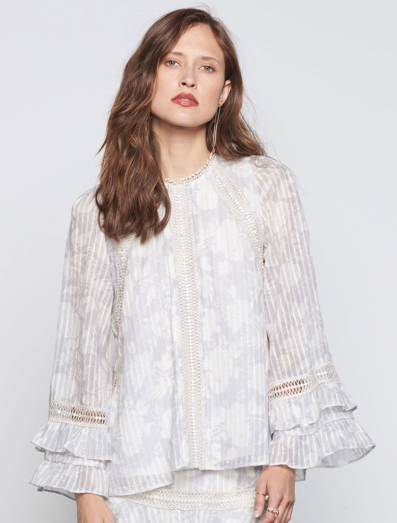 This beautiful blouse by Stevie May is crafted from a floral printed cotton and embellished with intricate lace panels. The Janie Top features billowy ruffled cuffs a rounded neckline and is designed for a loose relaxed fit.