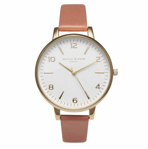 This beautiful vintage inspired watch has an over sized gold face and comes on a coral coloured soft leather strap.
