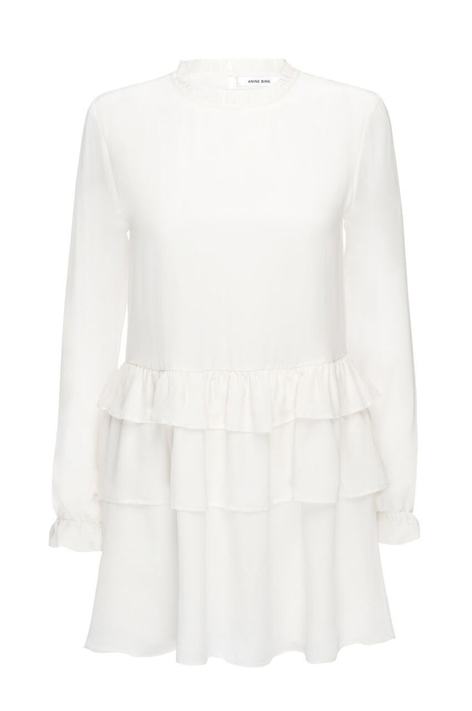 The Layered Silk Dress by Anine Bing is made in 100% Silk an features a high rounded gathered neckline, long sleeves with elasticated frill cuff and a centre back long keyhole opening with button closure. This relaxed style is a gorgeous option featuring drop waist gathered frills for a feminine edge.