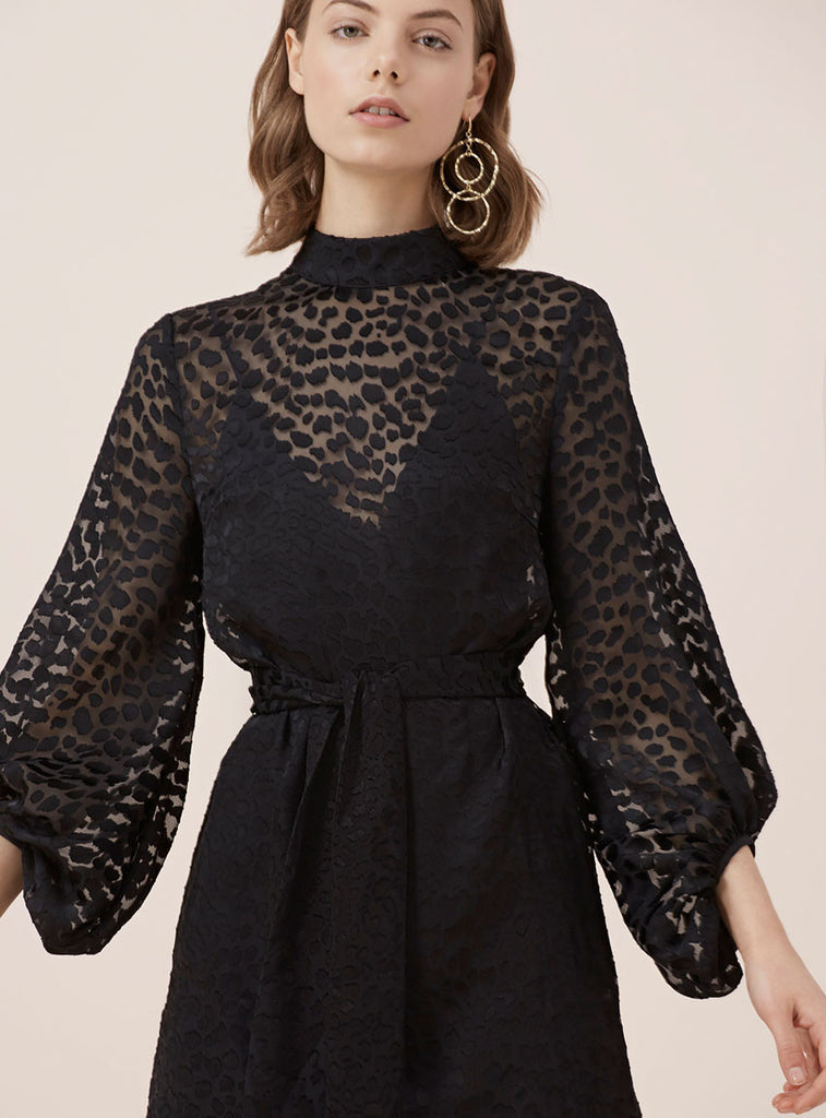 Keepsake Lovers L/S Mini Dress Top is a feminine style in a lightweight sheer fabric with an animal self spot print. Featuring a funnel neckline with double button closure, open split at back and tie belt to cinch in the waist. Finished with bell shaped sleeve and gathered cuff with button detail. Detachable slip included. Available now at The Annex.