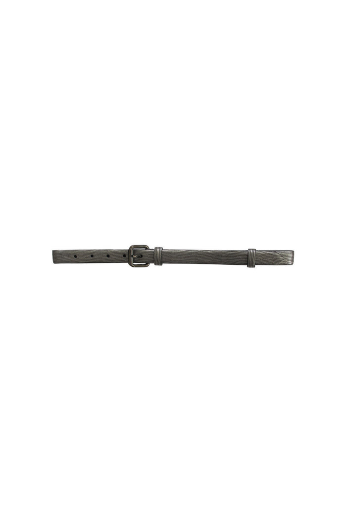 The Marching Belt by Life With Bird is a classic feathered edge belt with spaced double keeper at the front and features an industrial roller buckle. Available at The Annex in Pewter.