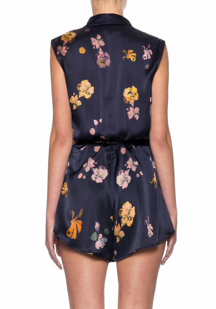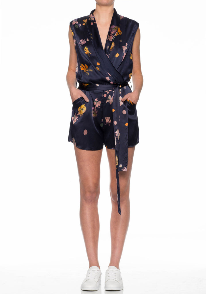 This effortless feminine shape playsuit is perfect for your summer wardrobe. Made in Vik & Woods Isle print in a luxurious silk, with draping neckline and flattering waist tie.