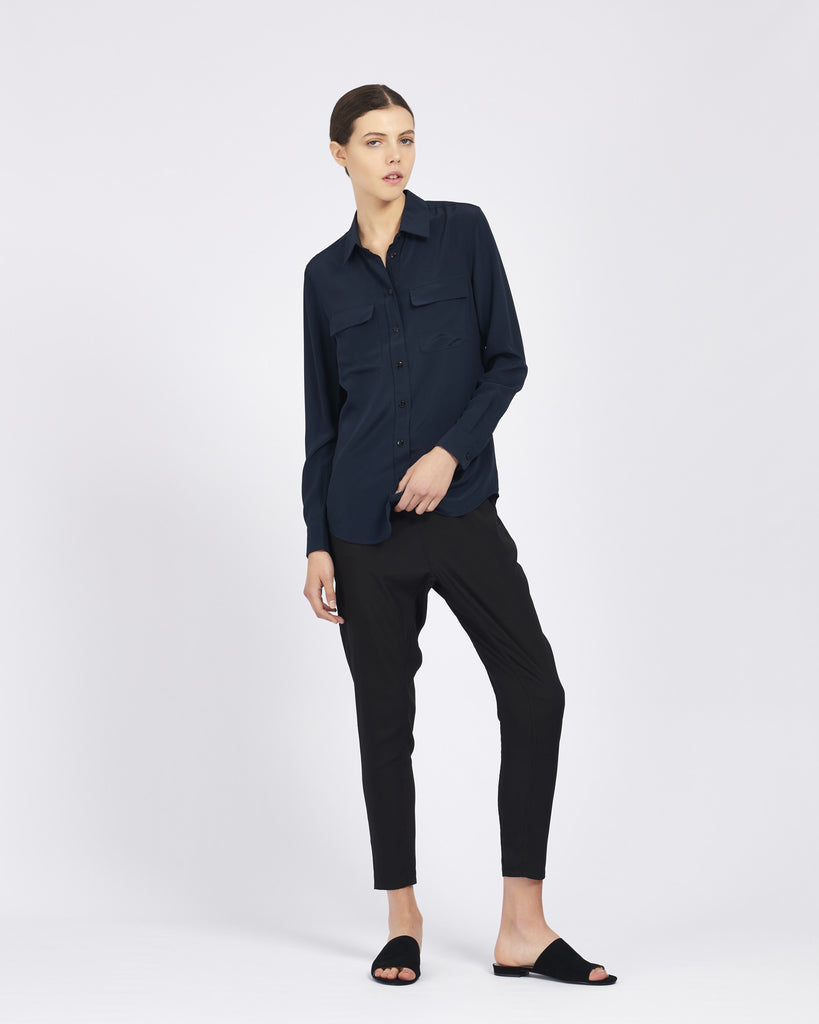 The Poppy Shirt by Ginia RTW is available at The Annex in Navy. A signature shirt which is timeless and classic, this 100% silk shirt features long sleeves, two front pockets, a slim fit and collar with button down centre front.
