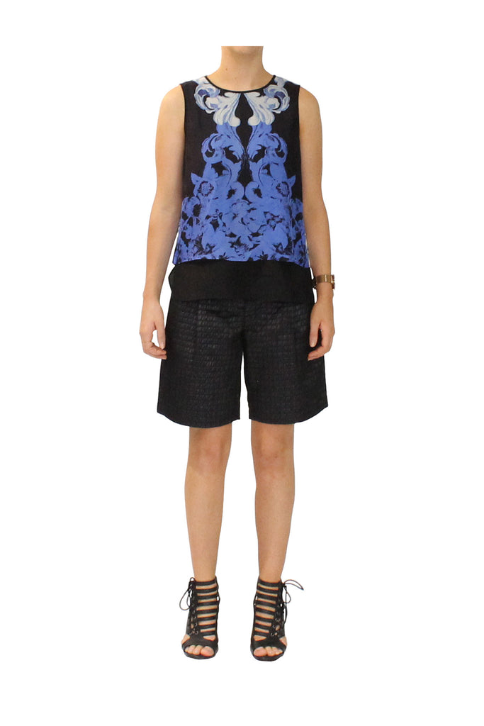 This layered and printed luxe tank top from Tibi creates a fabulously flattering textured silhouette. With a round neck and keyhole back with button loop closure, its made out of 100% silk.