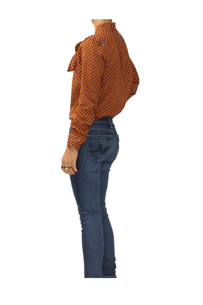Italy’s ‘la dolce vita’ and breathes the spirit of the Mediterranean into their exquisite pieces. This geometric orange print tie blouse features a rounded neckline, loose fit and button-details on cuffs. Crafted from pure cotton.