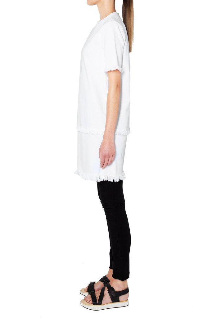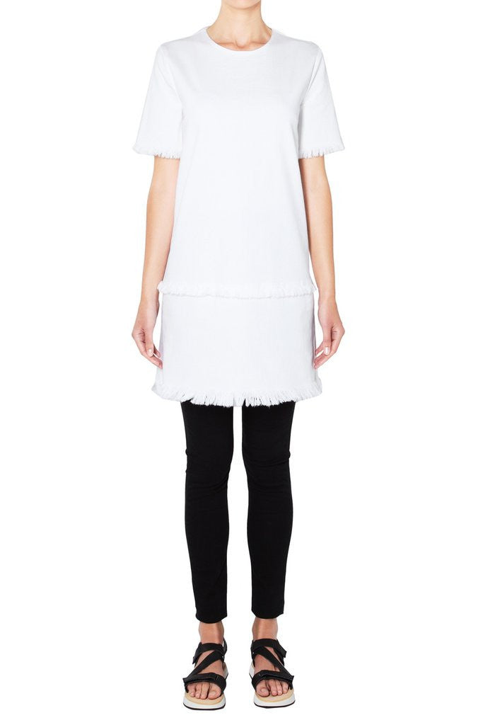 The Short Sleeve Fray Dress by LWB Life With Bird is available now at The Annex in White high power denim. Featuring short sleeves with a relaxed fit, centre back exposed metal zipper and frayed hip seam detailing.