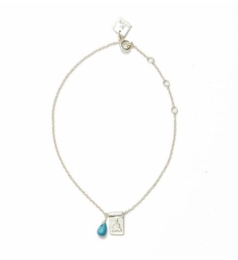 The Silver Little Buddha Sleeping Beauty bracelet features a 1cm x 5mm Buddha pendant on a 1mm thick and 19.5cm long chain with adjustable loops. This delicate style depicts the Buddha of Compassion and the Turquoise stone promotes wisdom and clear communication from the heart.