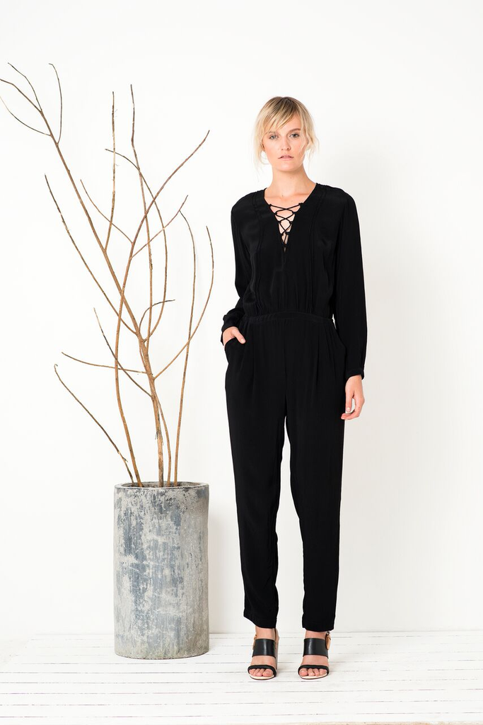 The Skyfall Jumpsuit by Bird & Kite is available now at The Annex in Black! Featuring a v neckline with spaghetti strap laced up front, gathered elasticated waistline, center back zipper closure and tapered pant with side seam pockets .
