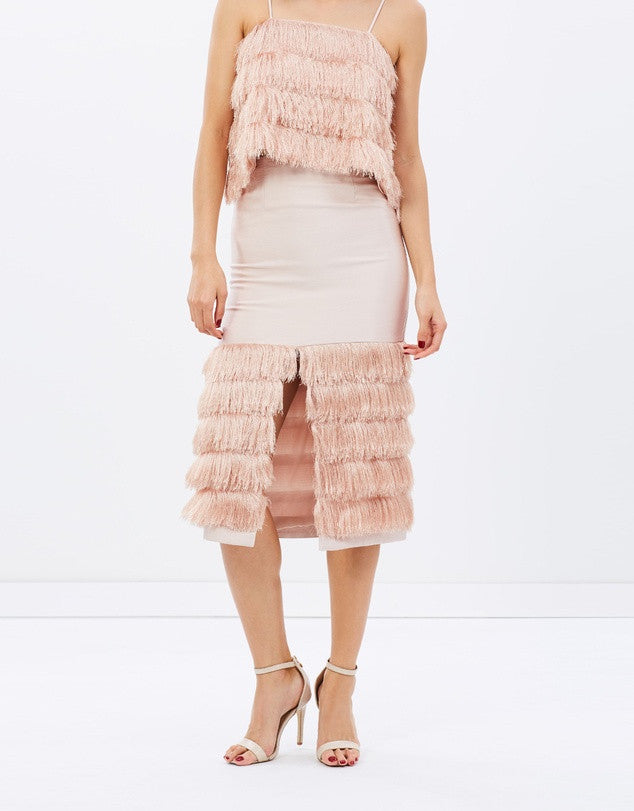 The C/MEO COLLECTIVE Slow Burn Skirt comes in a pretty blush pink and is trimmed with cascades of fringing. A high-cut front split is the perfect balance to the slim cut.
