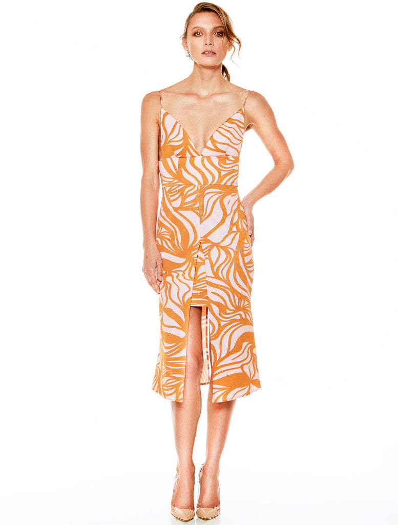 The Suddenly Midi Bodycon dress by Talulah is a sophisticated midi dress combining organic tones in a creative floral print. Designed to highlight your décolletage and back, this form-fitting dress has a short underlay panel, with an overlay skirt featuring a deep front and rear slit.  Partially lined, with a concealed rear zip and hook closure , this summer beauty is available at The Annex now.