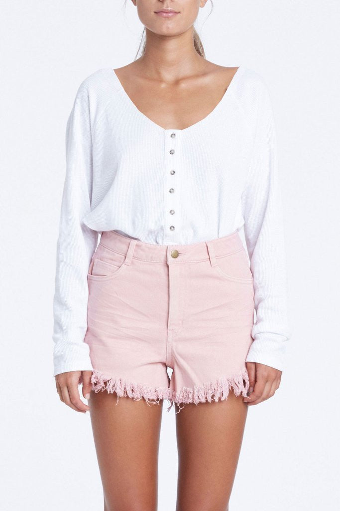 The cutest rigid cotton denim shorts in a musk colour is a summer must. These are a waisted, relaxed fit, featuring frayed leg, white ZZ leather patch and a brass metal denim button.