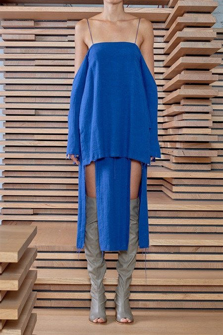 The Suspended Layered Dress by KitX is available now at The Annex! Crafted from a Cotton/Linen blend, this relaxed fit dress features thin shoulder straps, a squared off neckline with layered detailing and long off the shoulder sleeves with angled cut splits. Available in Paris Blue, this style has a center back metal zipper with inside button closures, KitX bind details throughout and shorter side paneling.