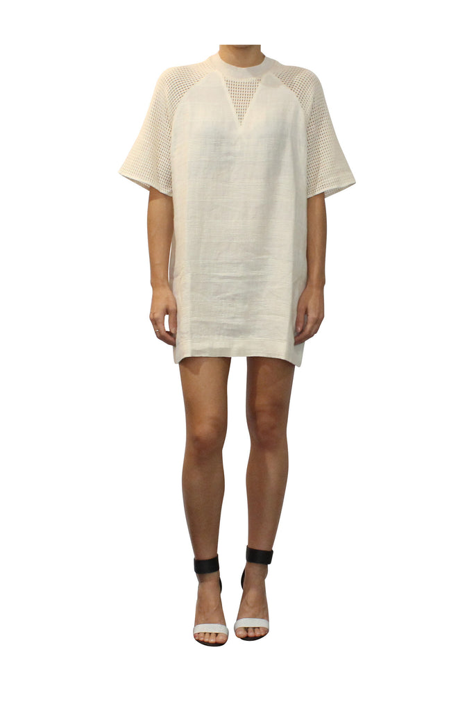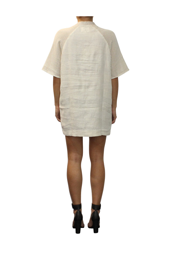 The Syana Raglan Tunic by Nanushka is available in a beautiful cotton/linen fabric with embossed stripe detail and netted fabric forms the raglan sleeve and a neckline panel. Soft ribbing on the neckline. Soft to feel and comfortable to wear. Made in Hungary. Our model wears size small.