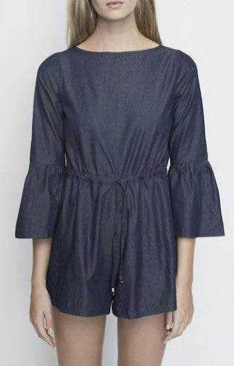 This Dark Denim Playsuit features cropped flared sleeves and tie in waist with a slight open back.