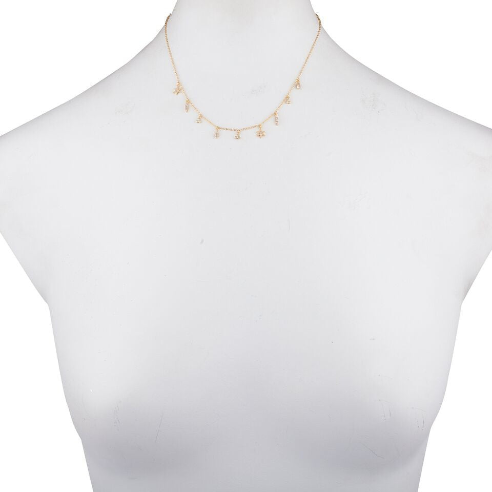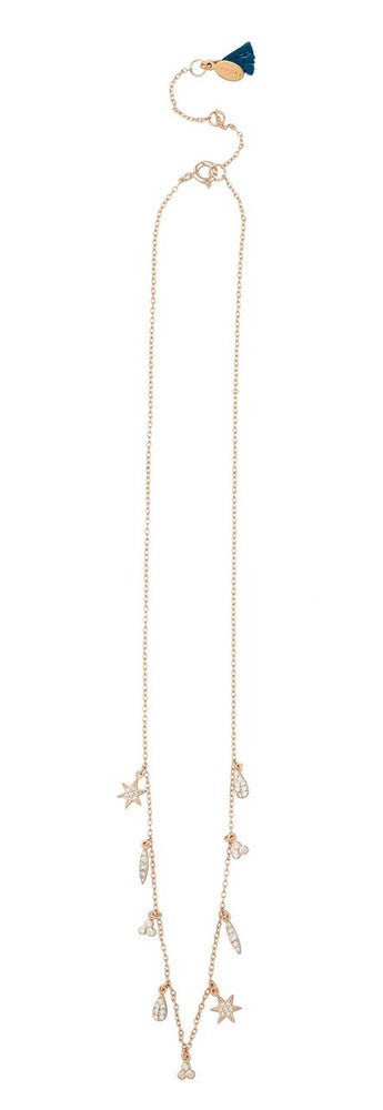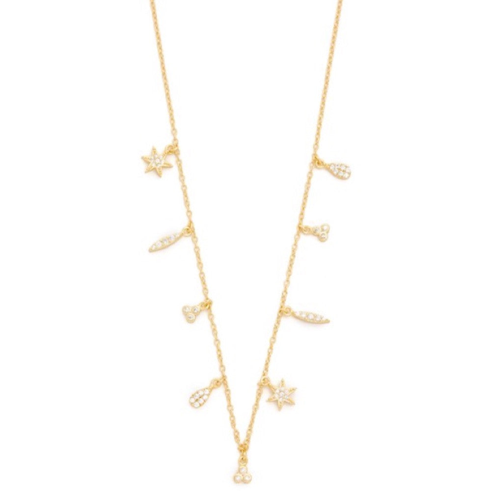 The Tori Charm Necklace by Shashi is crafted in 18K gold plated sterling silver and features charms with unique crystalized detail on each. Available now at The Annex in Yellow Gold.