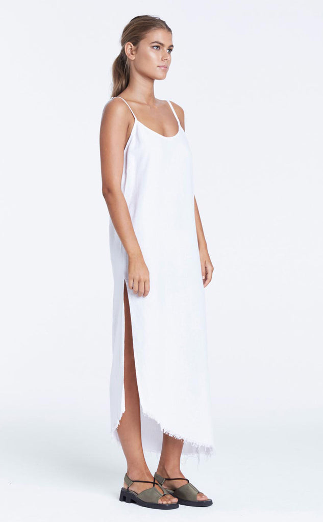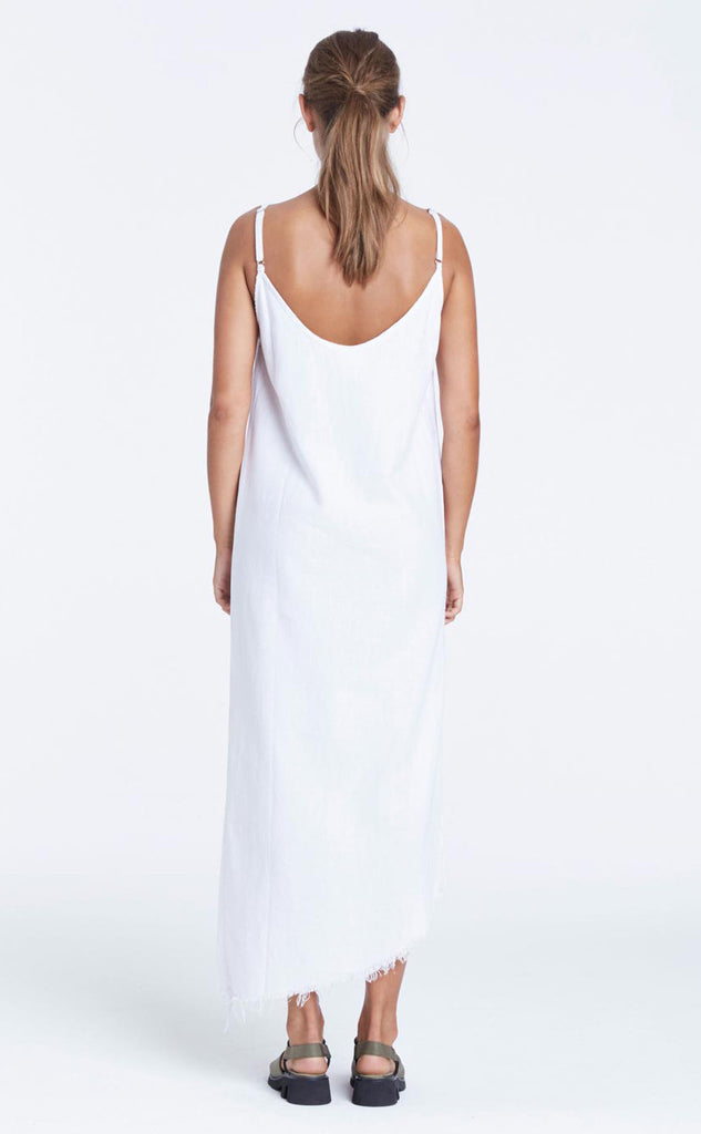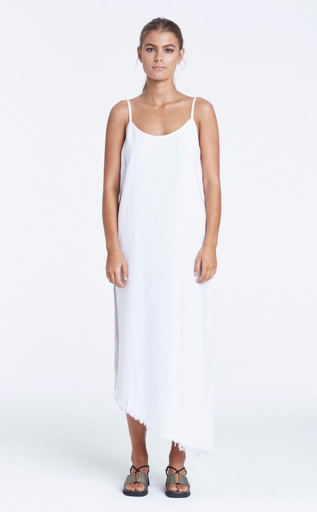 The Vista Dress by Zulu and Zephyr is available now at The Annex in whit. Crafted in a mid weight linen, this summer must have features a scoop neckline, adjustable thin straps, bust darts and an asymmetric fray detail hem with side split.