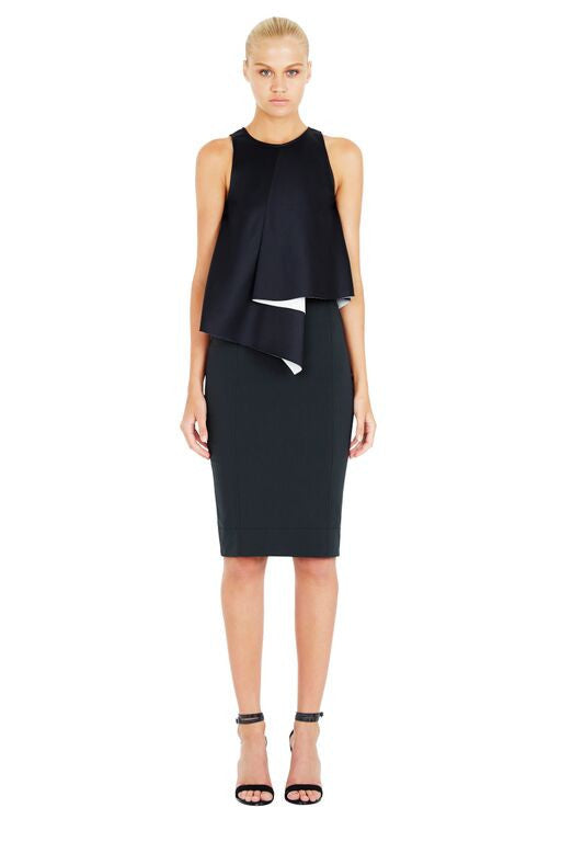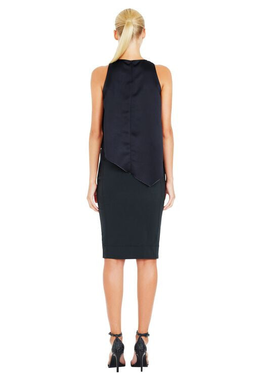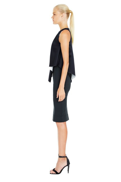 The Vreeland Top by Life With Bird is made in a polyester double bonded sided crepe satin, and features sleeveless cutaway armholes, center back invisible zipper and a front folded draped detail giving this top beautiful volume. Available at The Annex in Navy.