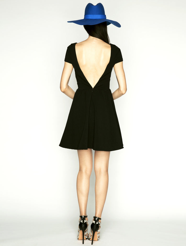 The 'You're My World Dress' by Tahlulah is a structured cap sleeve mini dress featuring an exaggerated v back and gathered flare skirt. Made from a textured ribbed Ponte makes this feminine dress an easy to wear and ultra flattering style on the body. Dry Clean Only.